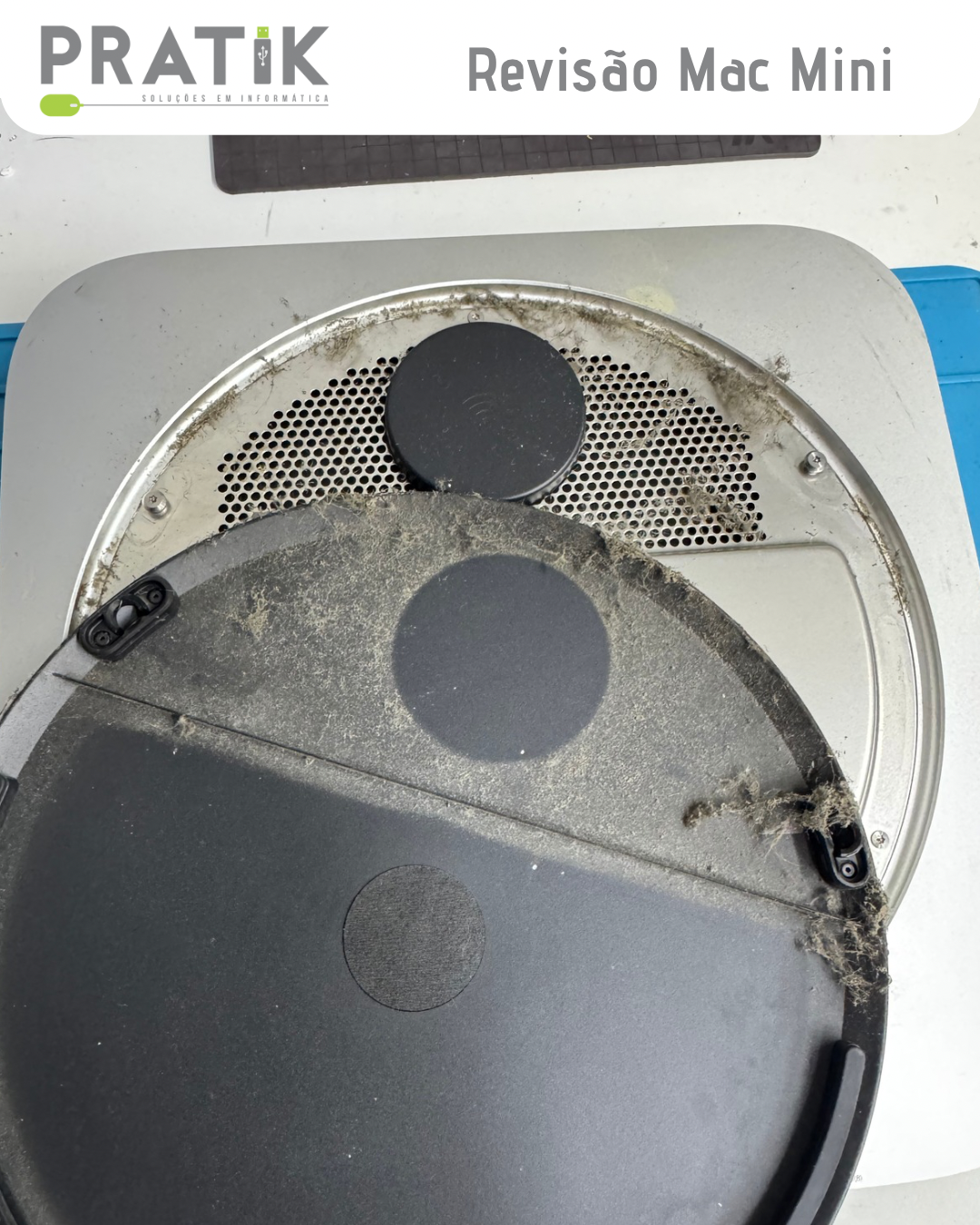 Esse Mac Mini (2014 – A1347) chegou aqui com o cooler sempre no máximo e travadinhas frequentes. O motivo? Poeira e pasta térmica ressecada!