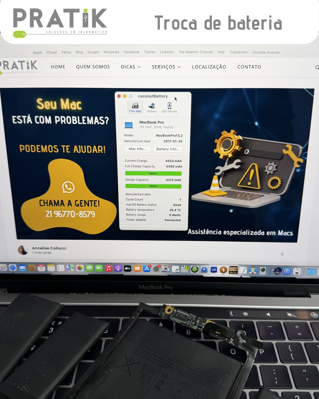 Depois de muitos anos de uso, a bateria desse MacBook chegou ao fim da sua vida útil — e até que durou bastante tempo! A durabilidade da bateria não é uma conta exata. Ela varia de acordo com diversos fatores, como a forma de uso, carregamento e até a temperatura do aparelho. Agora, com a bateria nova, o MacBook voltou a ter autonomia de verdade, permitindo várias horas de uso longe da tomada 💻⚡ Se o seu Mac já não segura carga como antes, pode ser hora de trocar a bateria.