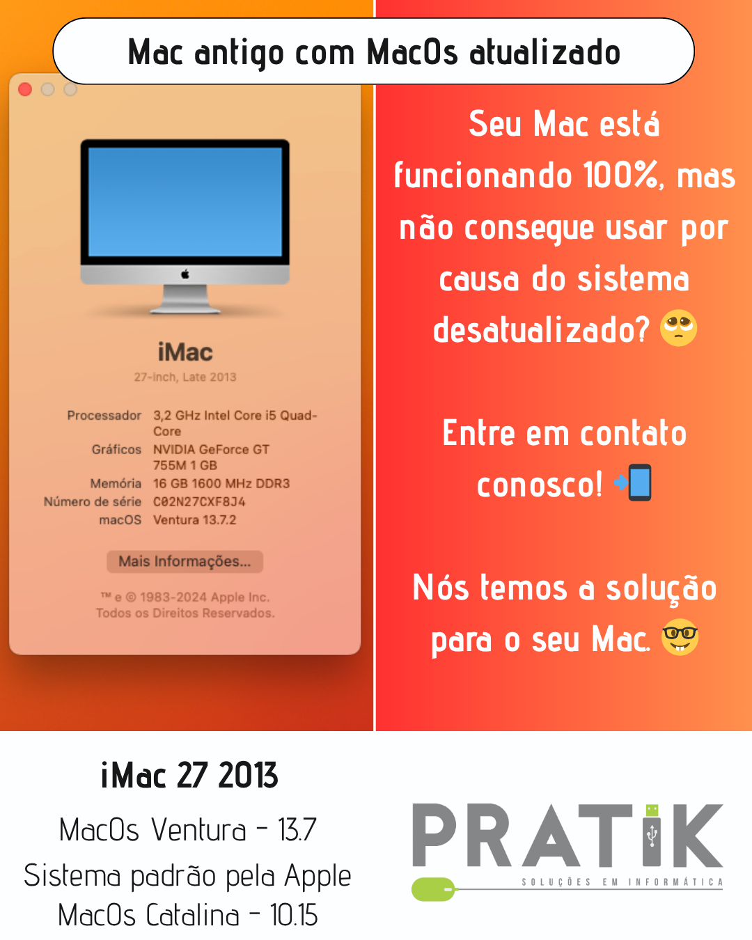 O iMac da imagem é de 2013, e por padrão da Apple ele só aceita até o macOS Catalina (10.15).Mas, com o método OpenCore, conseguimos instalar versões mais novas como o macOS Ventura (13.7) — mantendo o Mac atualizado e funcional! 💻✨ Funciona 100% igual ao sistema original?Funciona muito bem, mas nós sempre explicamos tudo com transparência:a Apple limita a atualização porque os modelos antigos têm hardware mais simples, e as versões novas do macOS são mais pesadas.O OpenCore faz diversas adaptações para que o sistema rode da melhor forma possível no seu Mac. ⚙️ 👉 Se o seu Mac está perfeito, mas o sistema está desatualizado, entre em contato…
